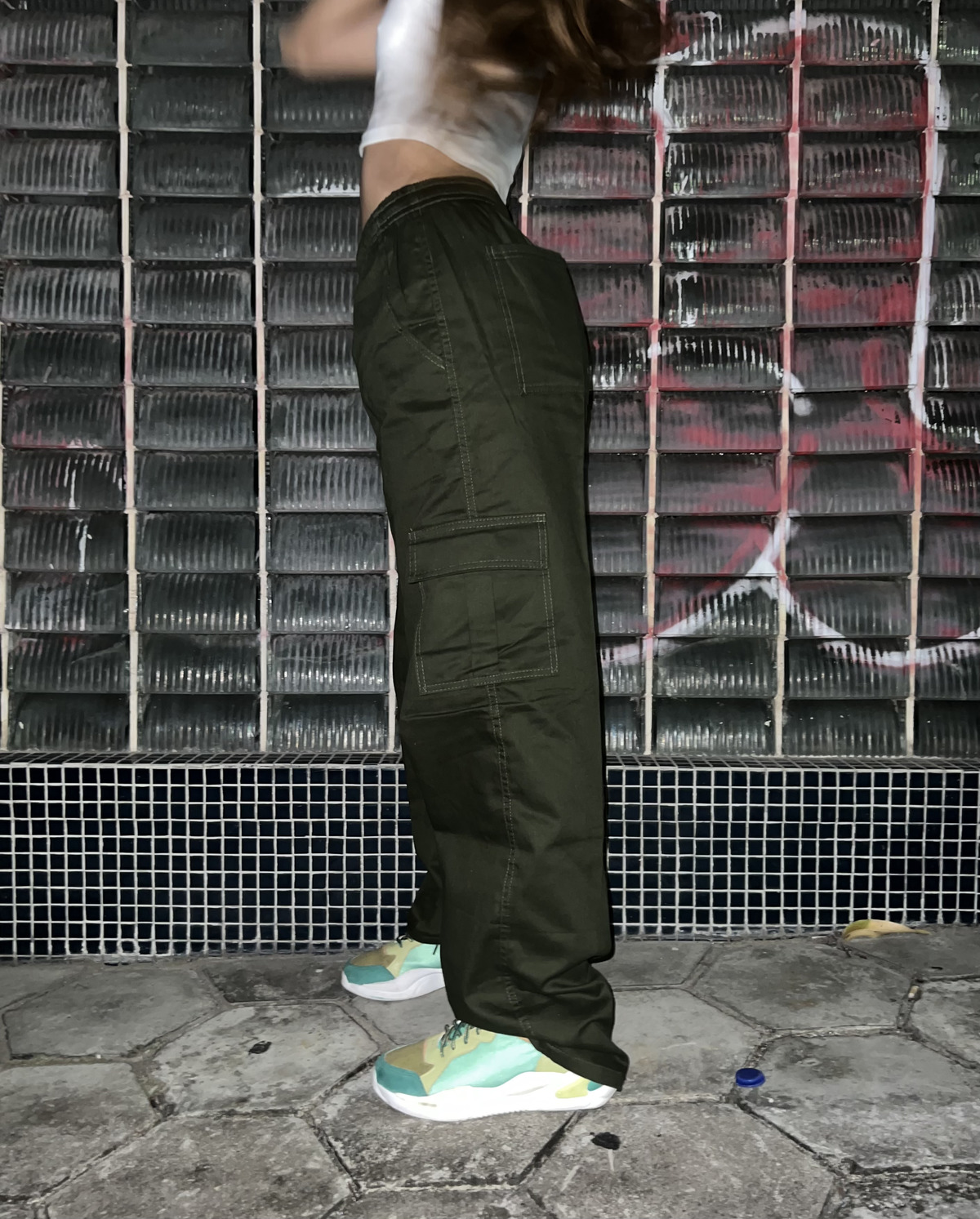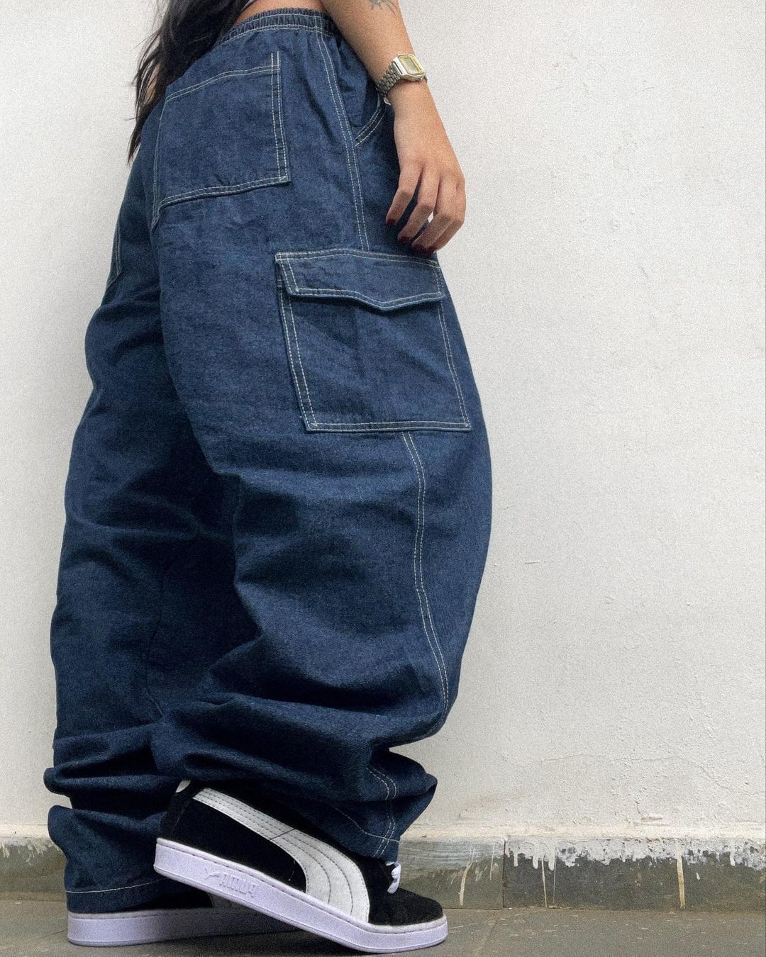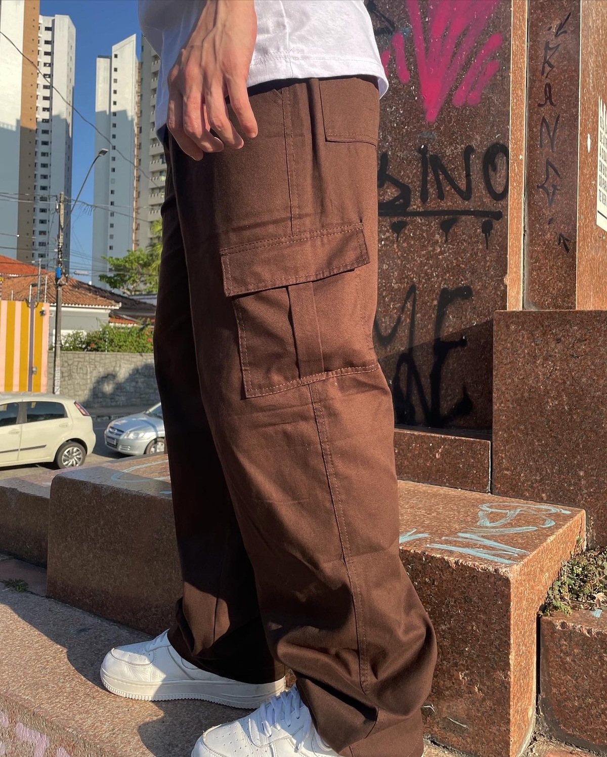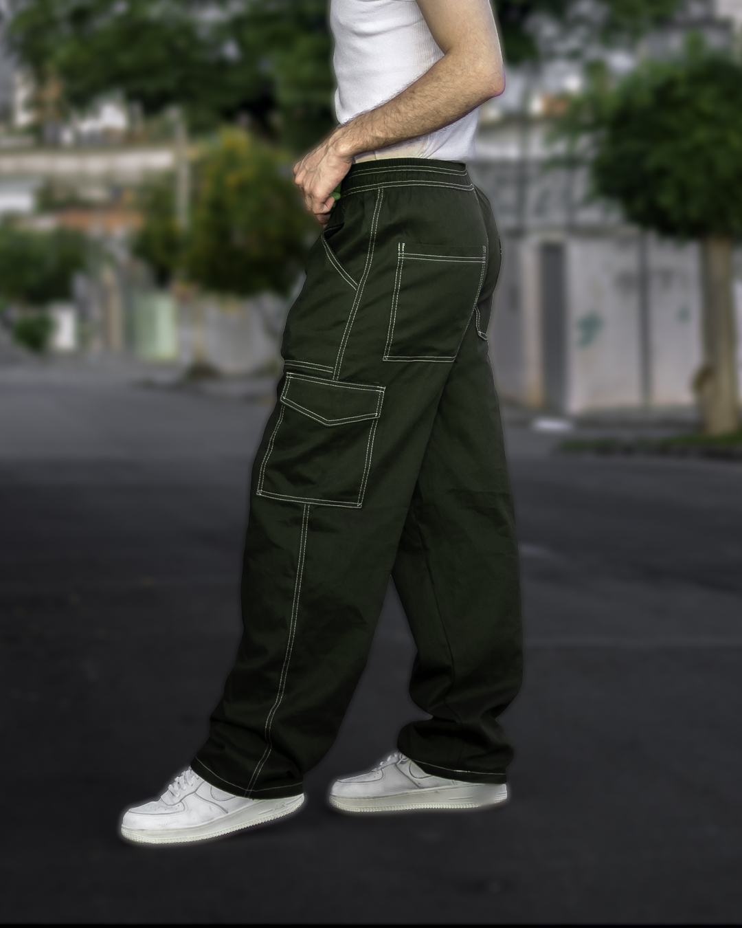 Calças em sarja premium, oversized, 6 bolsos funcionais, barra reta.