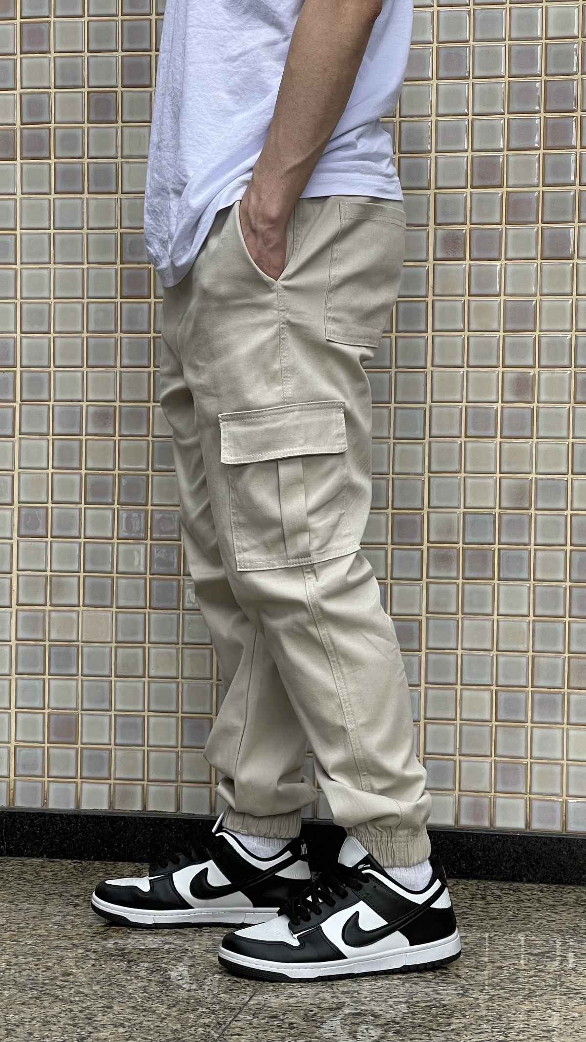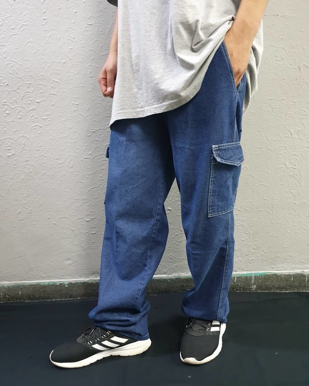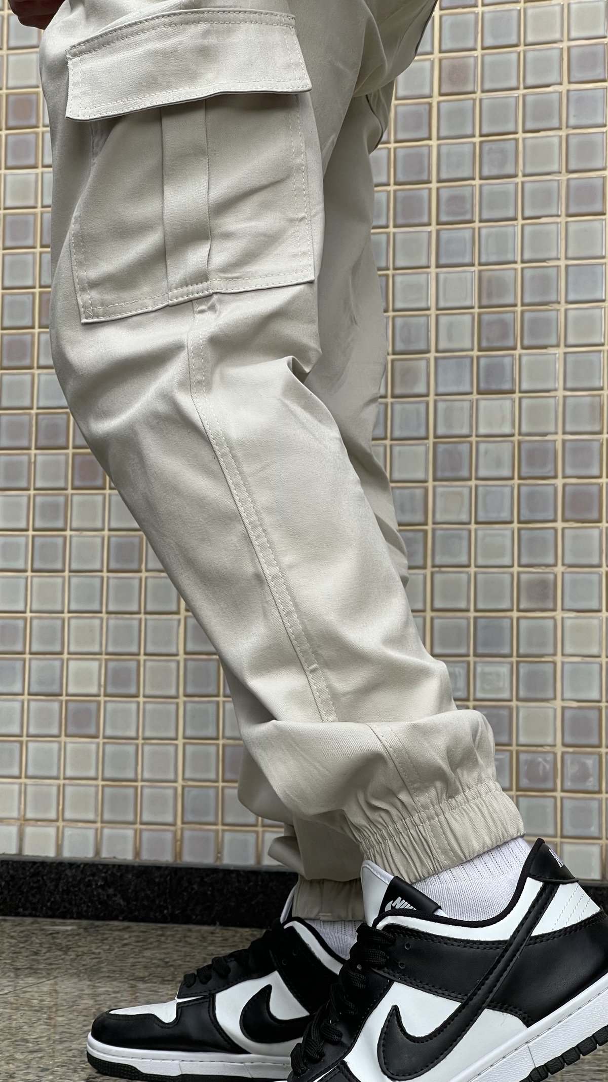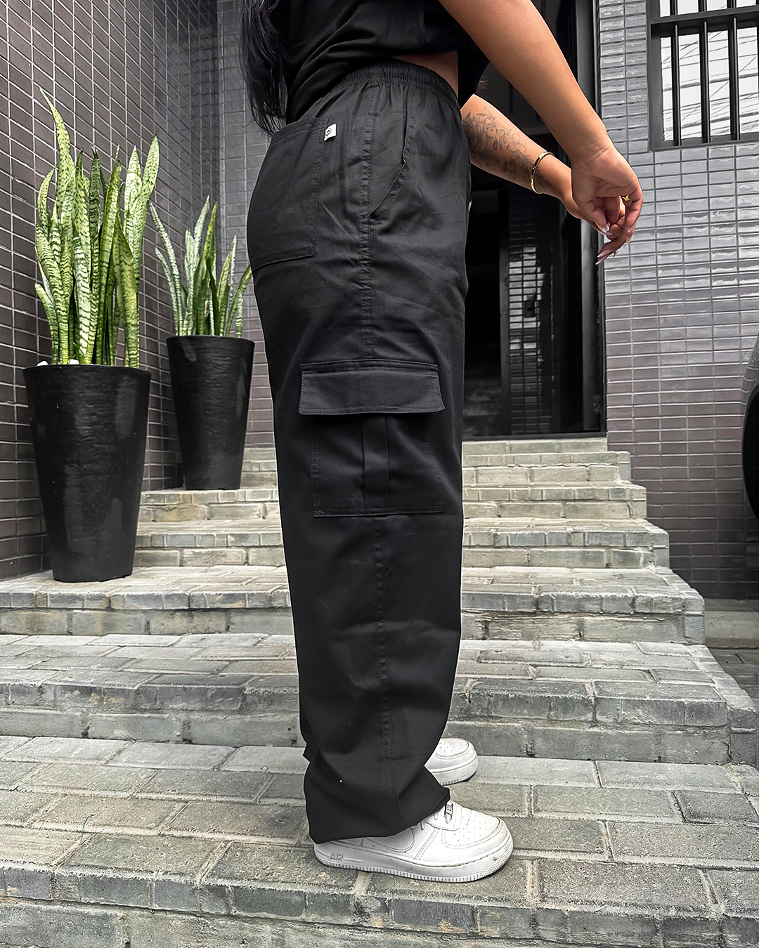 Calças em sarja premium, oversized, 6 bolsos funcionais, barra reta.