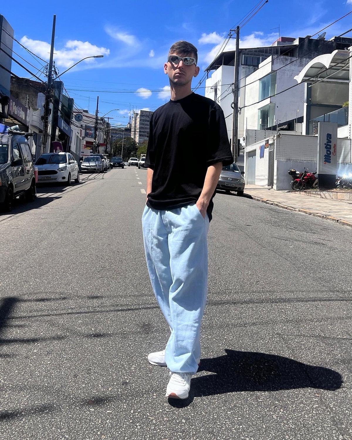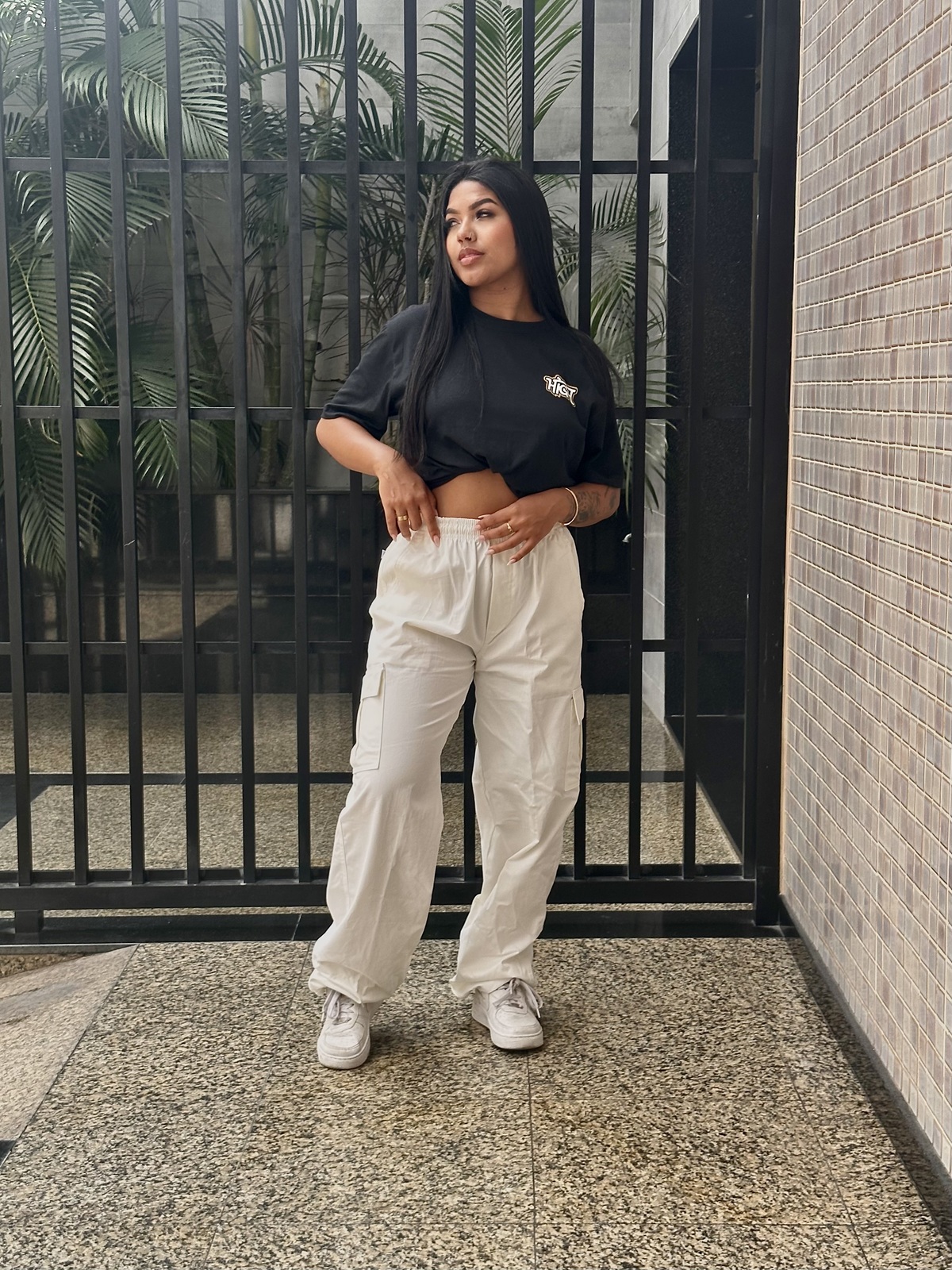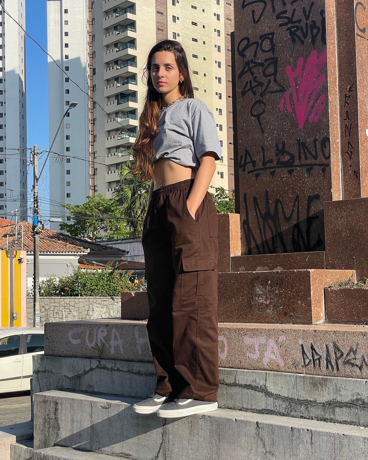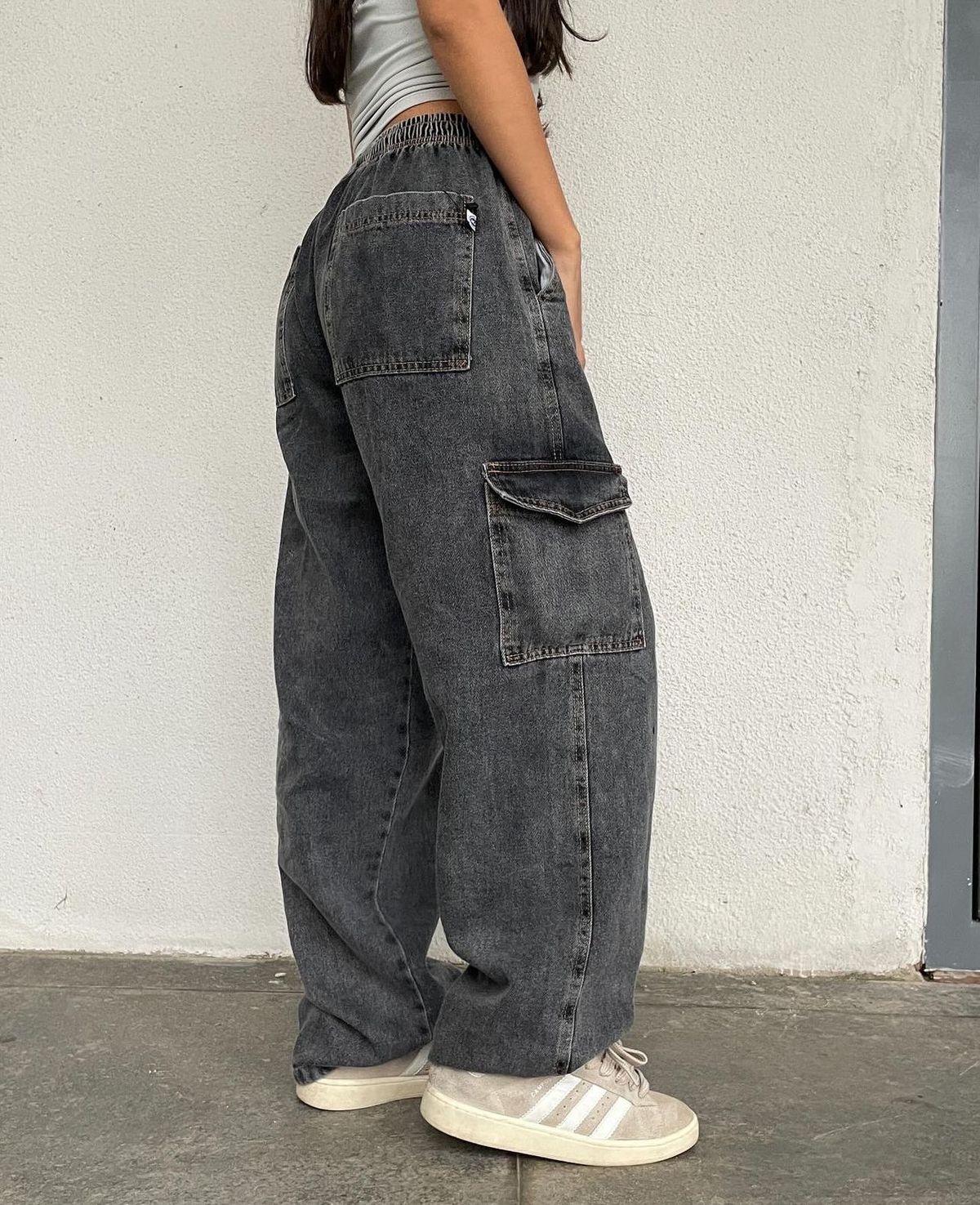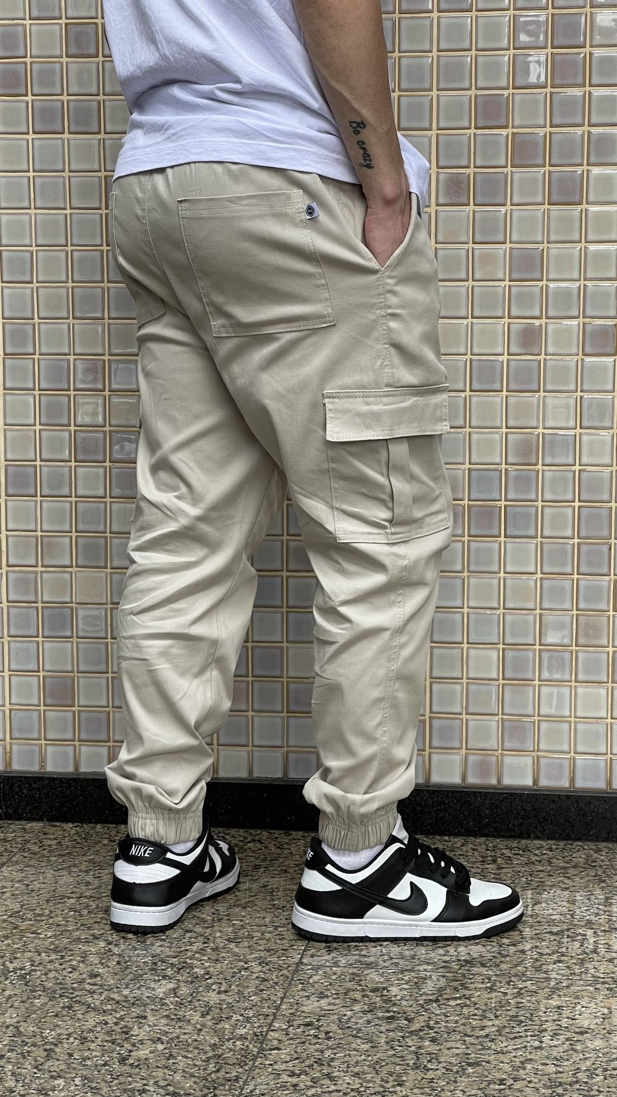 Calças em sarja premium, oversized, 6 bolsos funcionais, barra reta.