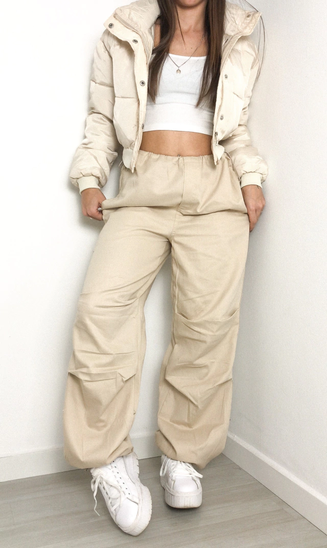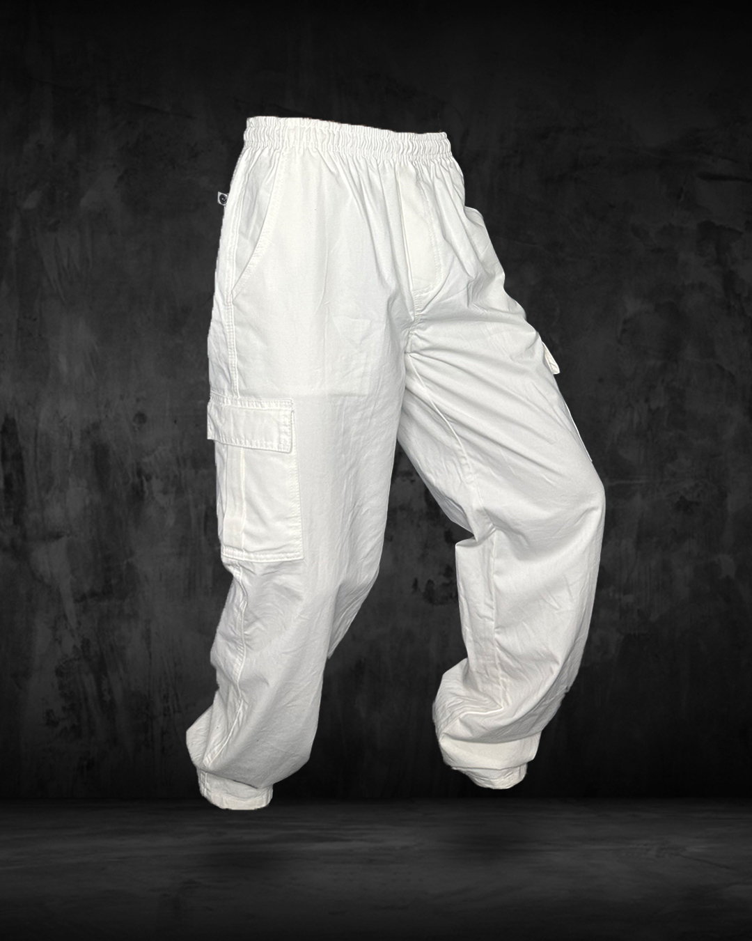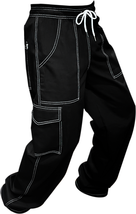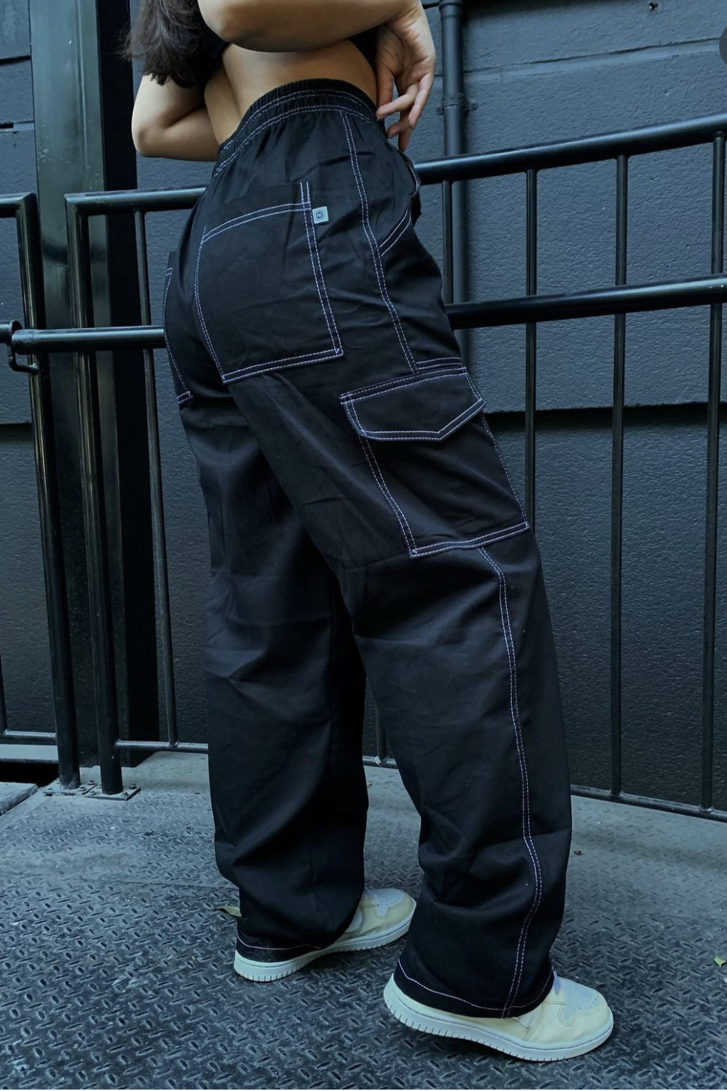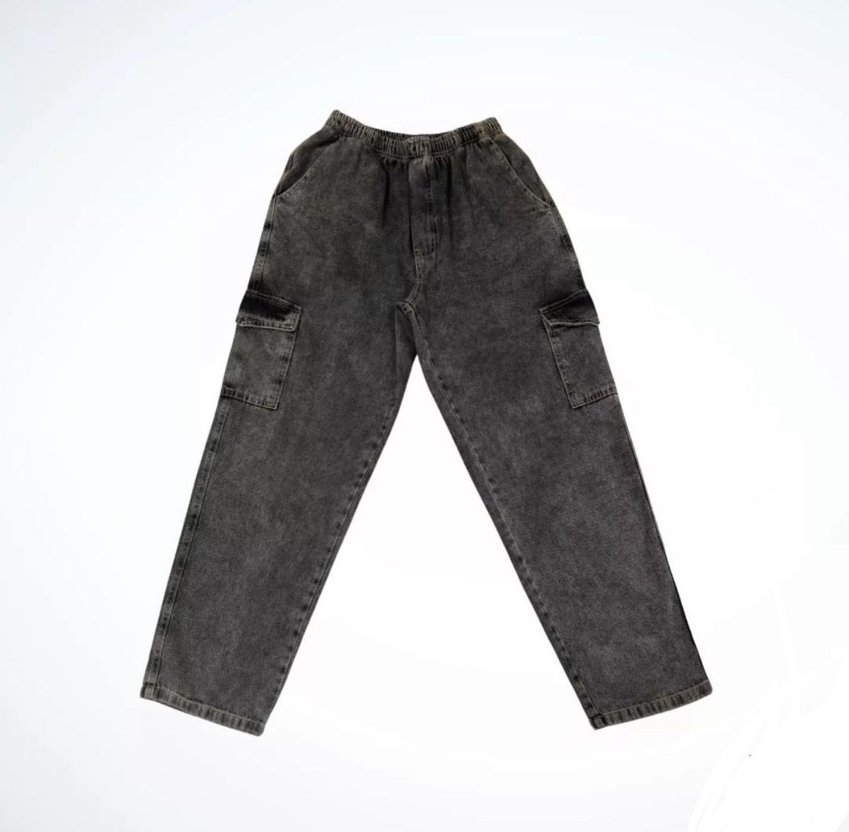 Calças em sarja premium, oversized, 6 bolsos funcionais, barra reta.